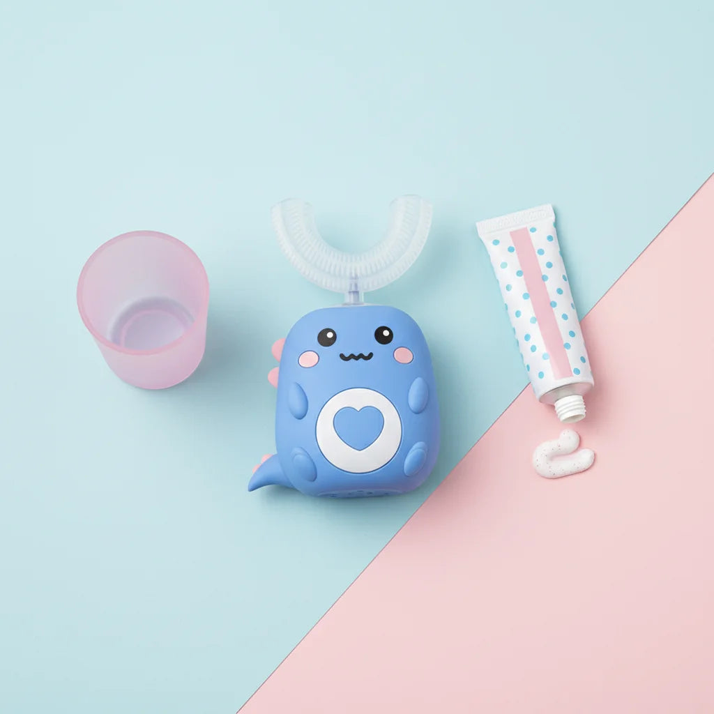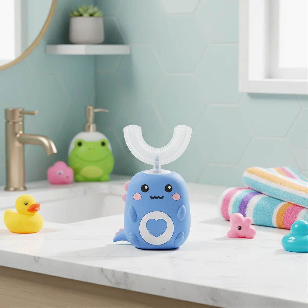 Toddla™ utiliza tecnologia ultrassônica 360º, limpando todos os dentes simultaneamente e removendo 82% mais placa do que uma escova manual. Seu design em U garante que cada superfície do dente seja alcançada, proporcionando uma limpeza completa e superior que as escovas tradicionais não conseguem igualar.