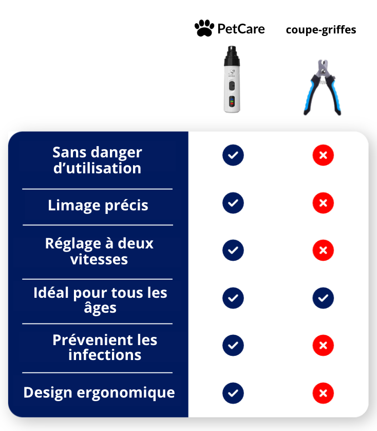 Une coupe inappropriée des griffes avec un coupe-griffes peut provoquer des modifications de la structure des griffes et des pattes, ce qui affecte la démarche de votre chien et exerce une pression sur ses articulations.