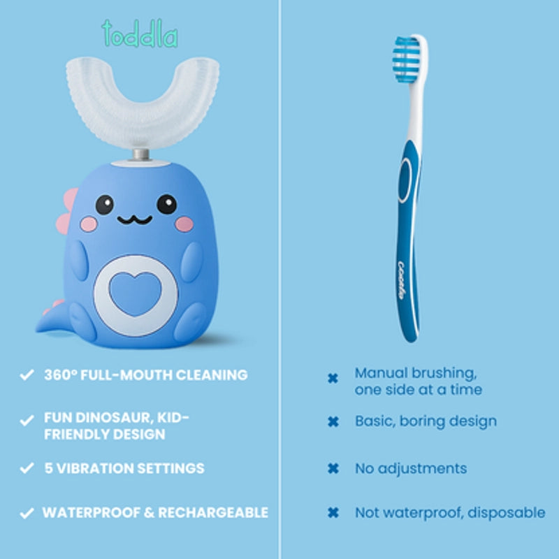 Convencer o teu pequeno a escovar os dentes não devia parecer uma batalha diária. Foi por isso que criámos a escova Toddla™ em formato U — uma solução suave e rápida que torna a escovagem realmente divertida. Com uma boquilha de silicone macio e um adorável design de dinossauro, a Toddla™ foi feita para mãos pequenas e atenções ainda mais curtas. Em apenas 60 segundos, limpa todos os dentes ao mesmo tempo — sem dramas, sem stress.